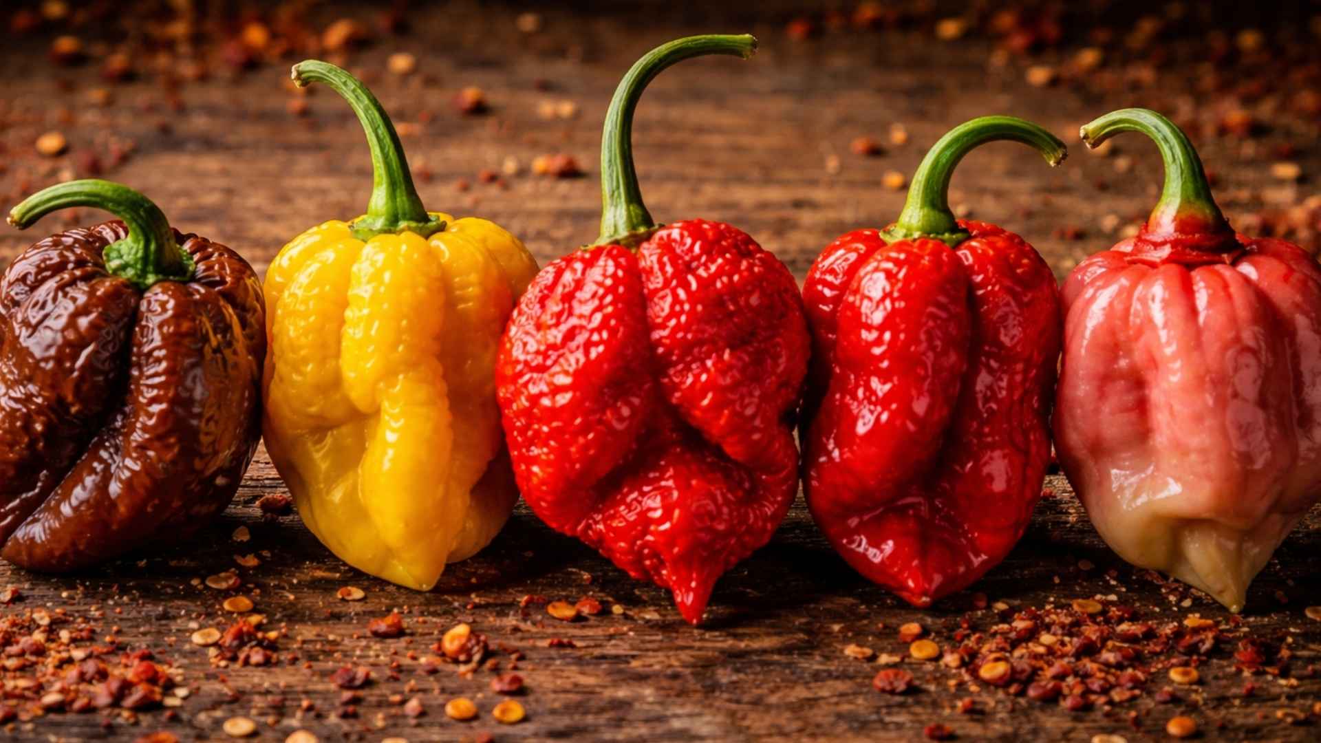 Wybrałem te pięć, bo łączą dwie rzeczy: (1) ostrość naprawdę z górnej półki, (2) charakter — smak, aromat, „rodzaj palenia”. I od razu ważna rzecz: kolor strąka nie jest bezpiecznikiem. Żółta, brązowa czy różowa wersja potrafi być równie agresywna jak czerwona — a różnice między partiami (uprawa, stres roślin, dojrzewanie) potrafią zrobić większą robotę niż sam kolor.